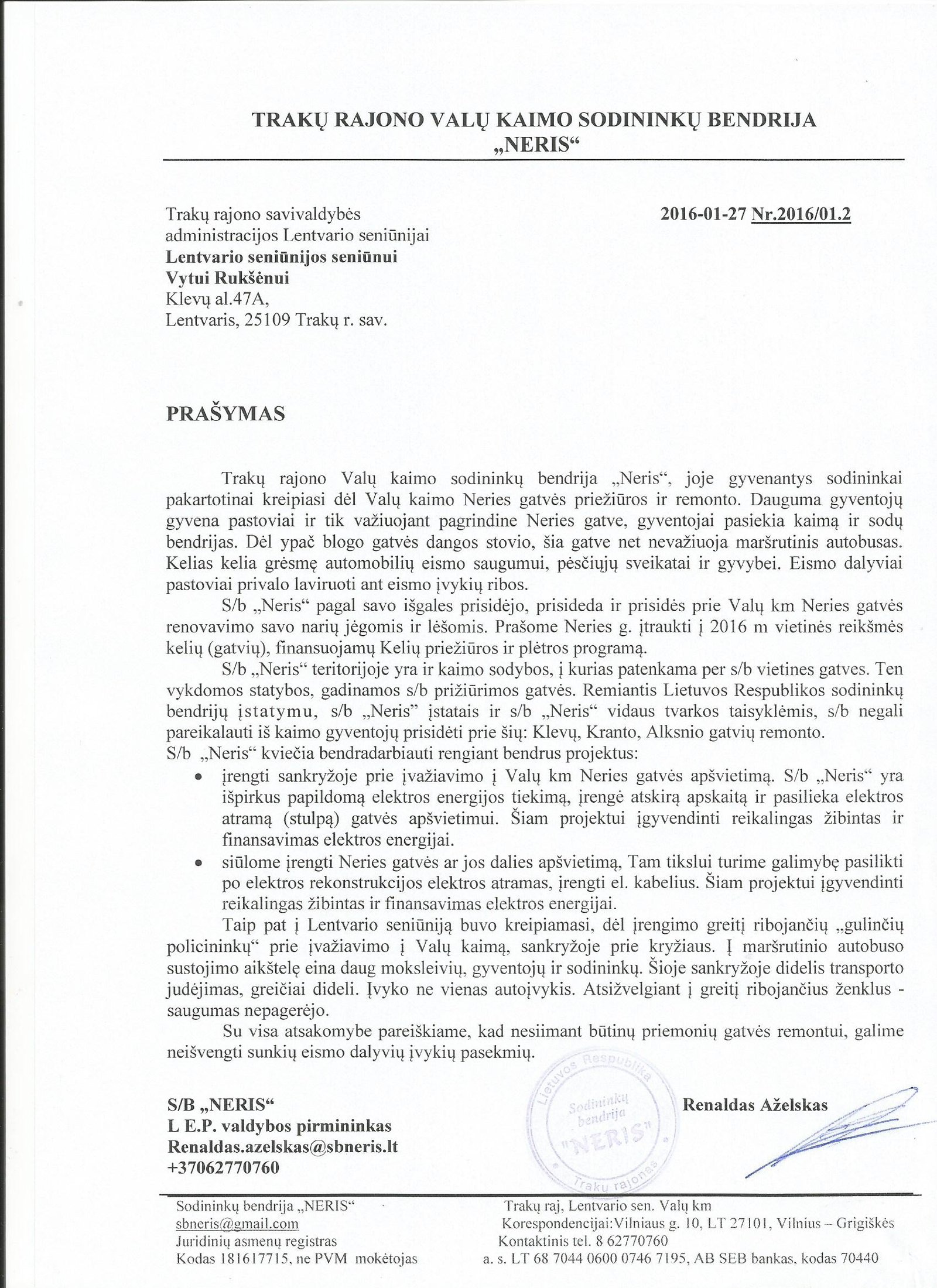Neries gatvės remontas, seniūnaičių sueigos sprendimu įrašytas į Lentvario seniūnijos investicijų projektų sąrašą 2016 metams.